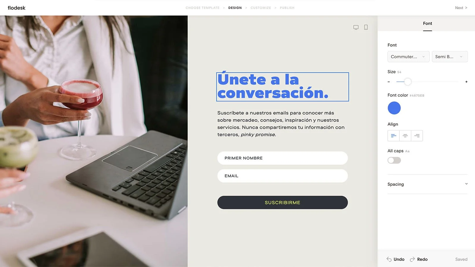 Somos rotundos fans del creador de emails de Flodesk, la herramienta que utilizas para crear y diseñar emails. Eleva la experiencia de tus suscriptores al recibir emails bien diseñados y visualmente atractivos, y hace que el proceso de diseñarlos sea divertido, incluso para personas sin experiencia con diseño.