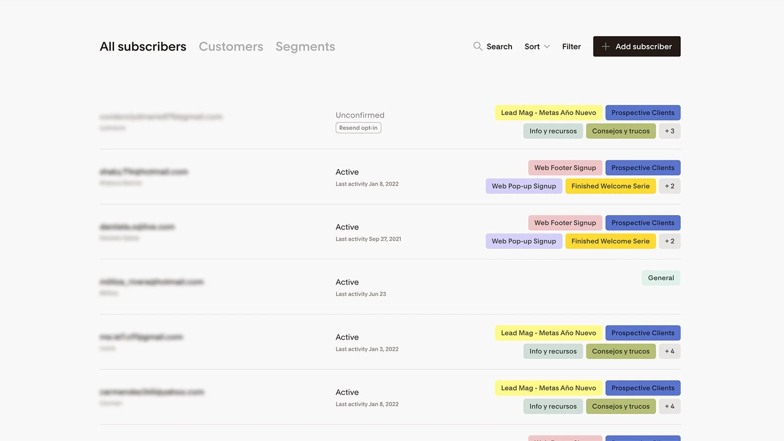 Tu lista de suscriptores puede darte un vistazo de cómo tu audiencia interactúa con tus emails. La lista muestra el estatus de un suscriptor (activo, dado de baja, etc.), la última fecha en que interactuó con uno de tus emails y los segmentos a los que pertenece (hablamos más sobre segmentos a continuación). También te permite filtrar tus suscriptores según su actividad, su origen y más.