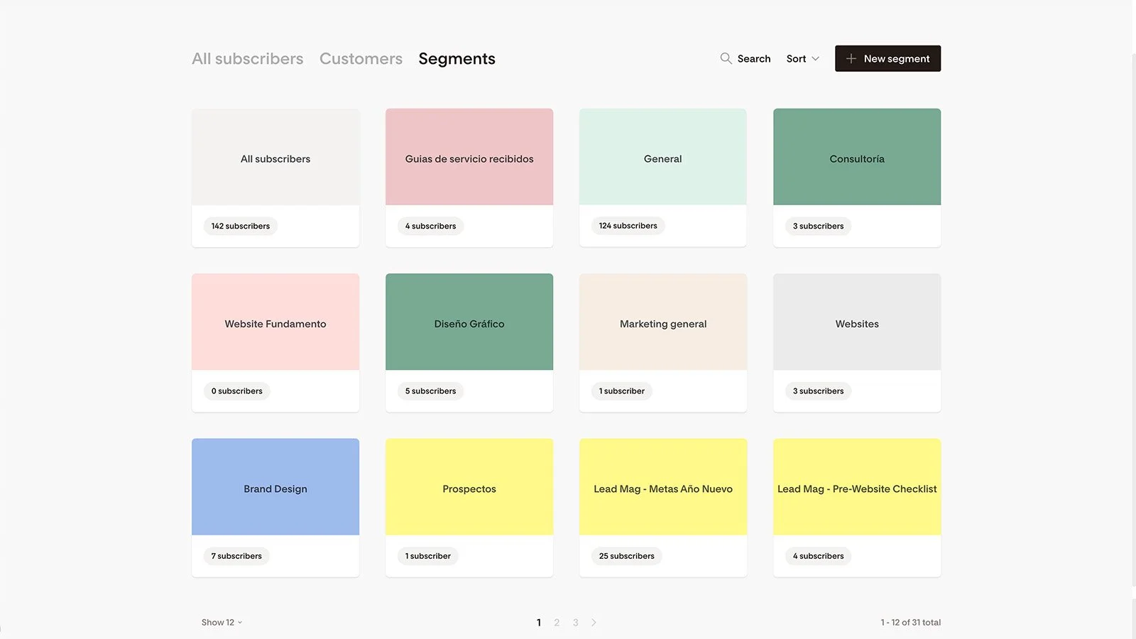 Existen dos formas de ver tus suscriptores en Flodesk. Puedes ver una lista completa de tus suscriptores o verlos por segmentos: