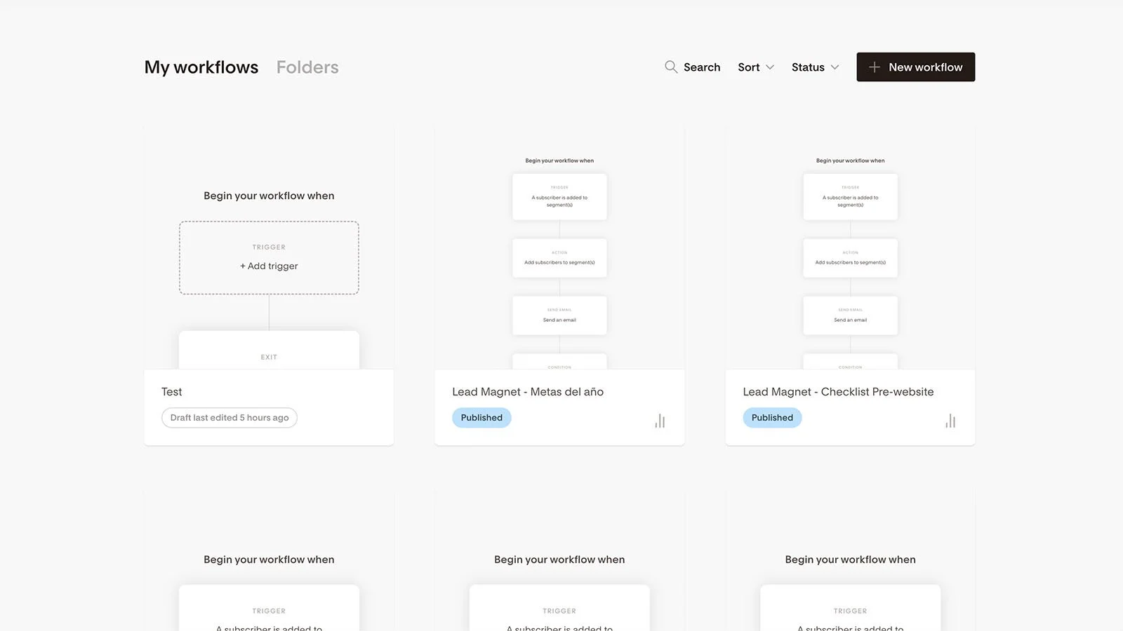 Workflows, o flujos de trabajo, son la herramienta que se usa para crear secuencias de emails en Flodesk. Puedes ver todos tus workflows de un vistazo.