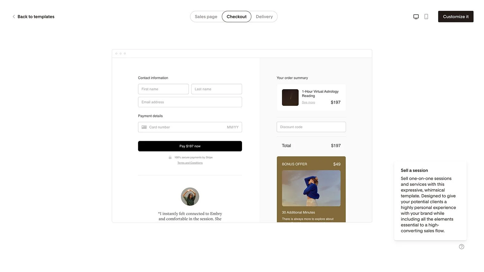 Flodesk recientemente lanzó Checkout, un servicio que te permite crear landing pages para vender productos o servicios online. Al igual que con emails, Flodesk ofrece una variedad de plantillas para facilitar la creación de páginas, y conecta con Stripe para aceptar pagos.